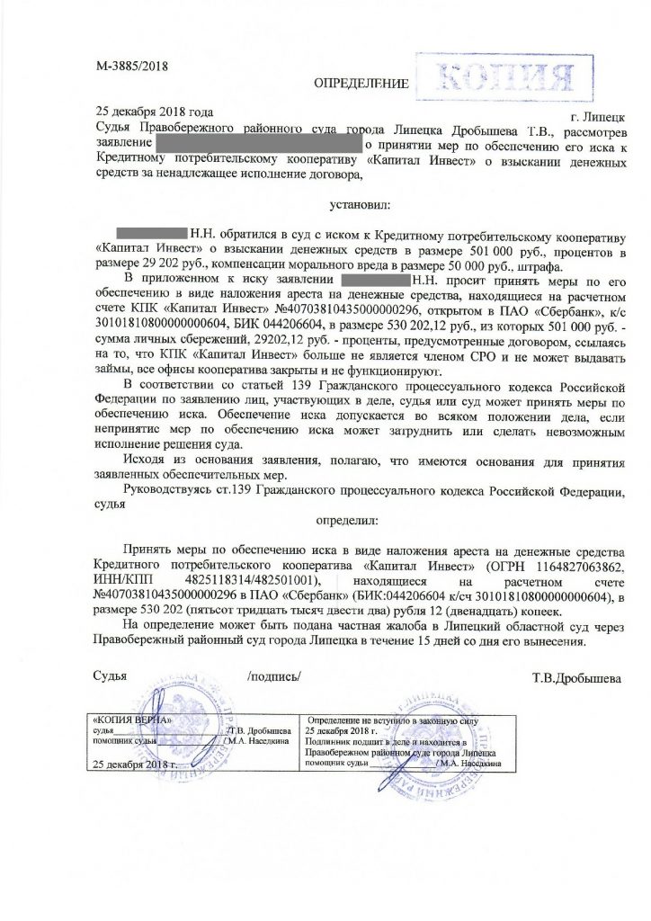 ВНИМАНИЕ! При подачи искового заявления также мы готовим заявление о наложении ареста на расчетные счета КПК в качестве обеспечительных мер. Суд по нашему заявлению накладывает арест на денежные средства, находящиеся на счете КПК.